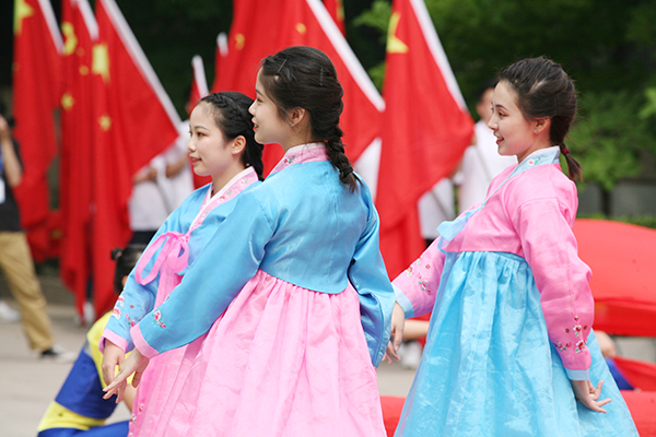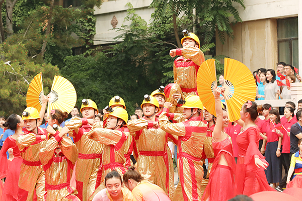 红旗飘扬,红绸招展,舞姿轻盈的舞者们中间,脚步铿锵的矿业工程师形象,代表着我校的矿业与安全特色。