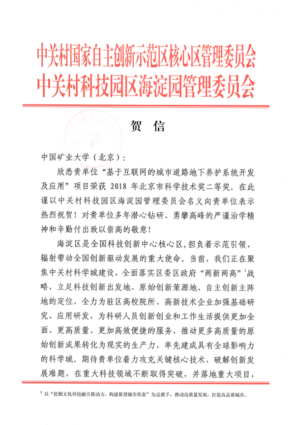 本网讯3月1日,中关村科技园区海淀园管理委员会发来贺信,祝贺我校彭苏萍院士团队完成的科技成果“基于互联网的城市道路地下养护系统开发及应用”获得2018年度北京市科学技术奖二等奖(获奖编号:2018城-2-005)。贺信中强调海淀区是全国科技创新中心核心区,担负着示范引领、辐射带动全国创新驱动发展的重大使命。管委会正聚焦中关村科学城建设,全面落实区委区政府“两新两高”战略,全力为驻区高校和科研人员提供更加全面、更高质量、更加高效便捷的服务,率先建成具有全球影响力的科学城,同时也期待着我校在重大科技领域取得更大突破。