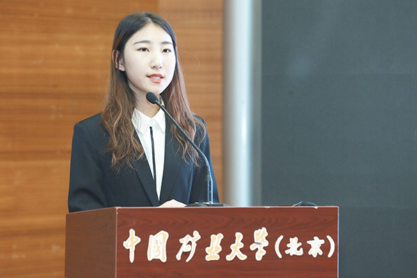 来自沙河校区的地质2018级学生刘冰雪作为学生代表向母校送上生日祝福。她汇报了沙河校区学生学习、本科生全程导师制、学生志愿服务、社会实践活动等情况,并表示永远铭记并践行“明德至善,好学力行”的校训,做有责任心、有担当、有作为的矿大人!