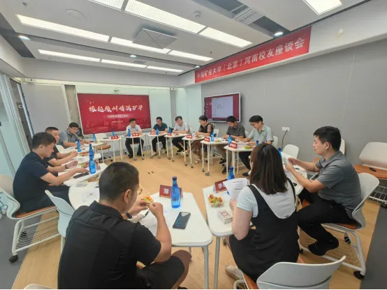 郑州校友座谈会在翼欧教育科技有限公司举行,由英语10级李攀妹校友主持。营销03级申帅杰、地质05级邓小娟、电气07级郑磊、营销08级邵应举、采矿08级刘杰、安全硕09级闫本正、会计09级乔木、化学09级李贺、力学12级张登强等校友代表参加座谈会。